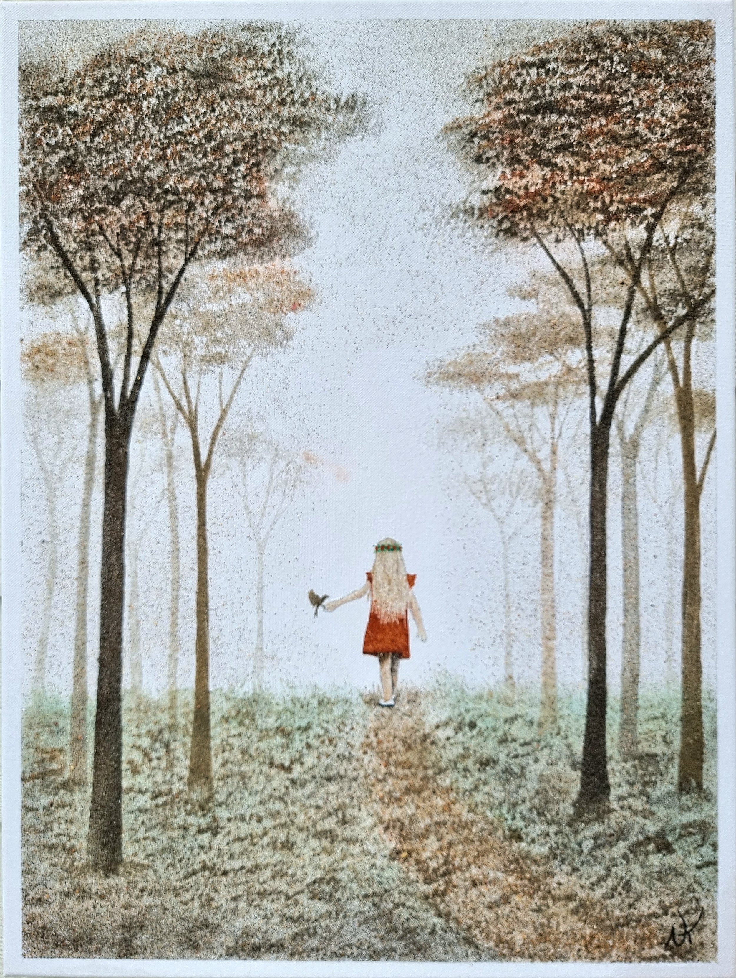 Created with 10 shades of pure and natural New Zealand sand and green crushed glass on stretched canvas.